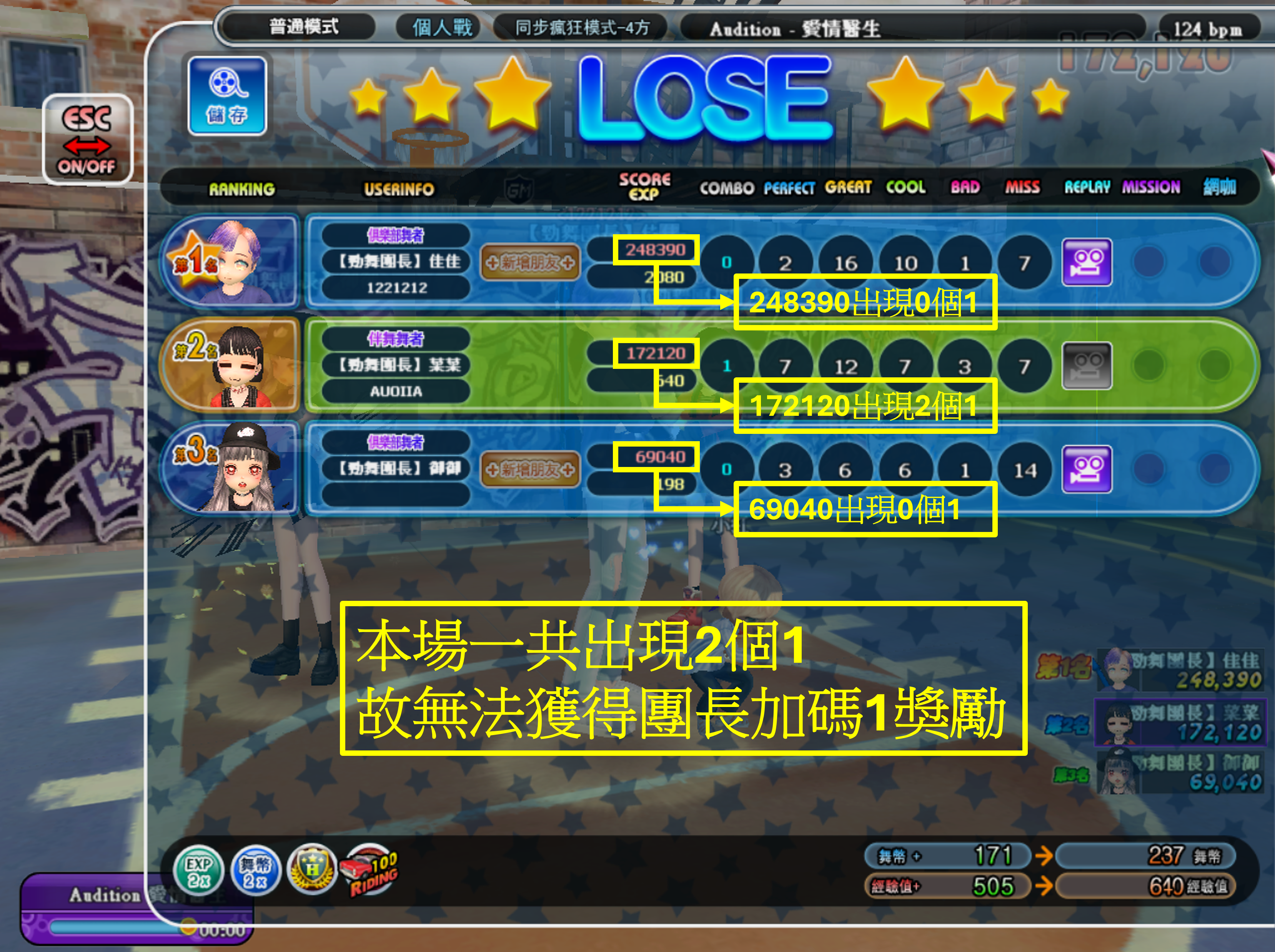 ●於結算畫面得到的舞幣為【0】,該場不予計算