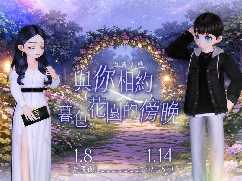 活動期間內累積消費達指定點數,即可獲得對應性別的 暮色花園 清幽的傍晚 情侶款 服裝部位道具。