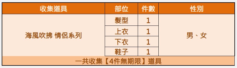 在活動期間內身上持有海風吹拂 情侶系列 四件(無期限)