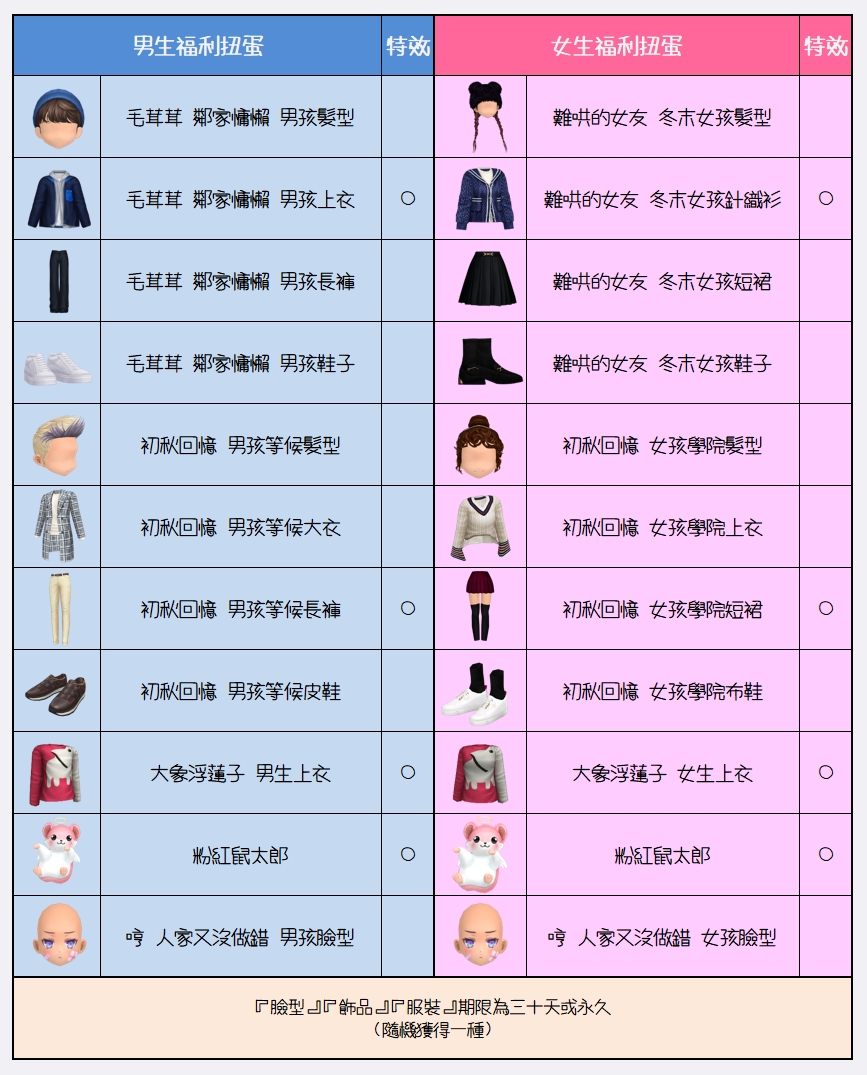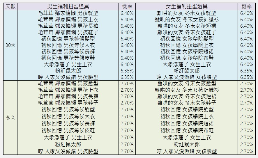 福利扭蛋的時裝內容物只有【永久】或30天。:.゚ヽ(*´∀`)ノ゚.:。