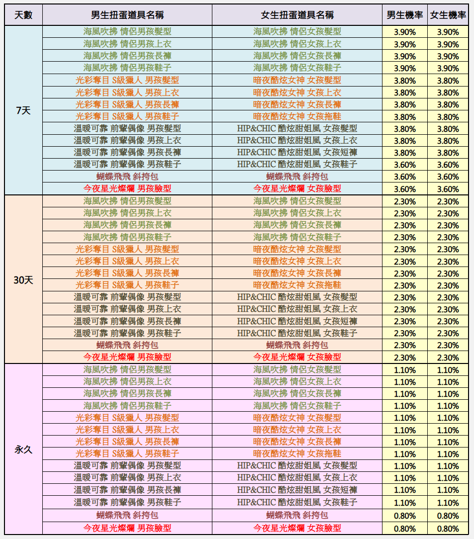 ●扭蛋獎品上獲得的道具時效分為7天,30天,永久、365天,使用乙次。.