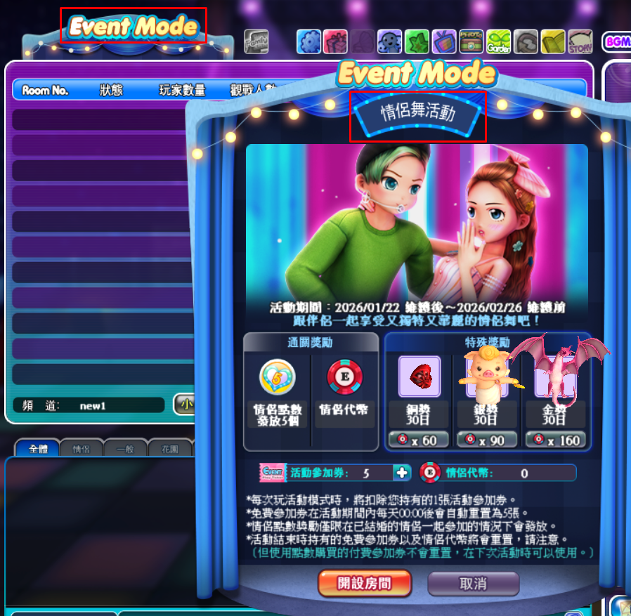 | 規則 | 活動結束時,持有的免費參加券、情侶代幣將會重置,請注意。 |