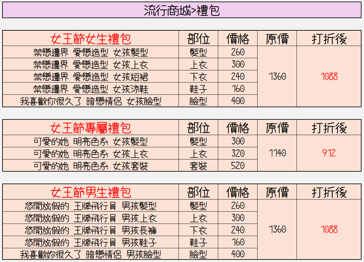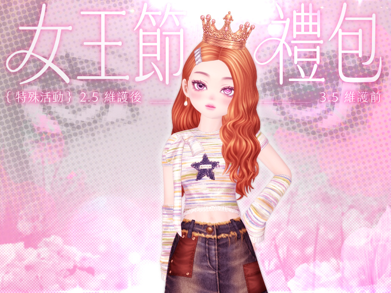 [活動公告] 【特殊活動】女王節禮包(╯✧∇✧)╯ 公告人員 登錄日期 2026-02-05 08:00:00 瀏覽次數 3276 ►活動時間 2026/02/05~03/05維護時下架 ►參加資格 全伺服器玩家均可參與 ►活動說明 ※本禮包消費計入2月消費活動累計! ※本禮包消費計入2月消費活動累計! ※本禮包消費計入2月消費活動累計! ※若購買後期限為非無期限請重新啟動遊戲即可 ※禮包於03/05維護時下架 【悠閒放假的 王牌飛行員 男孩套裝】 【禁戀邊界 愛戀造型 女孩套裝】 【我喜歡妳很久了 暗戀情侶 男孩臉型】 【我喜歡你很久了 暗戀情侶 女孩臉型】 【可愛的她 明亮色系 女孩套裝】 回列表