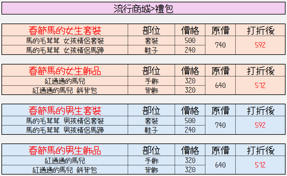 範例3:佳佳團長只有買了春節馬的男生套裝 禮包,則在發獎日不會獲得任何獎勵道具。