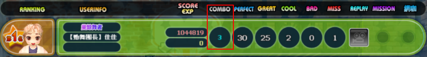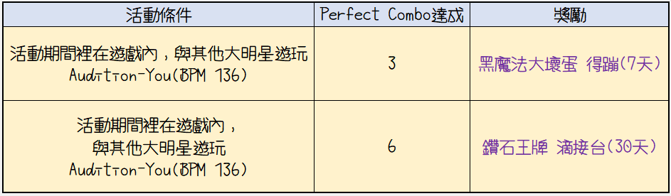 結算時Perfect Combo數達3跟6分別可獲得黑魔法大壞蛋 得蹦(7天)跟鑽石王牌 滴接台(30天)