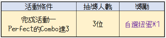 活動期間內完成活動一Perfect Combo達3的條件即可參加抽獎,將會抽出3位幸運兒獲得自選扭蛋*1。