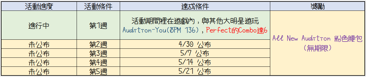 活動期間裡在遊戲內指定同步瘋狂模式-4方向,與其他大明星遊玩Audition-You(BPM 136)的結算畫面中,