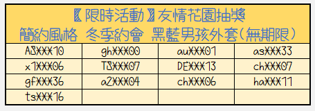 女生:簡約風格 冬季約會 白紅女孩外套 (無期限) 男生:簡約風格 冬季約會 黑藍男孩外套 (無期限) (皆為友情花園中的服飾) |