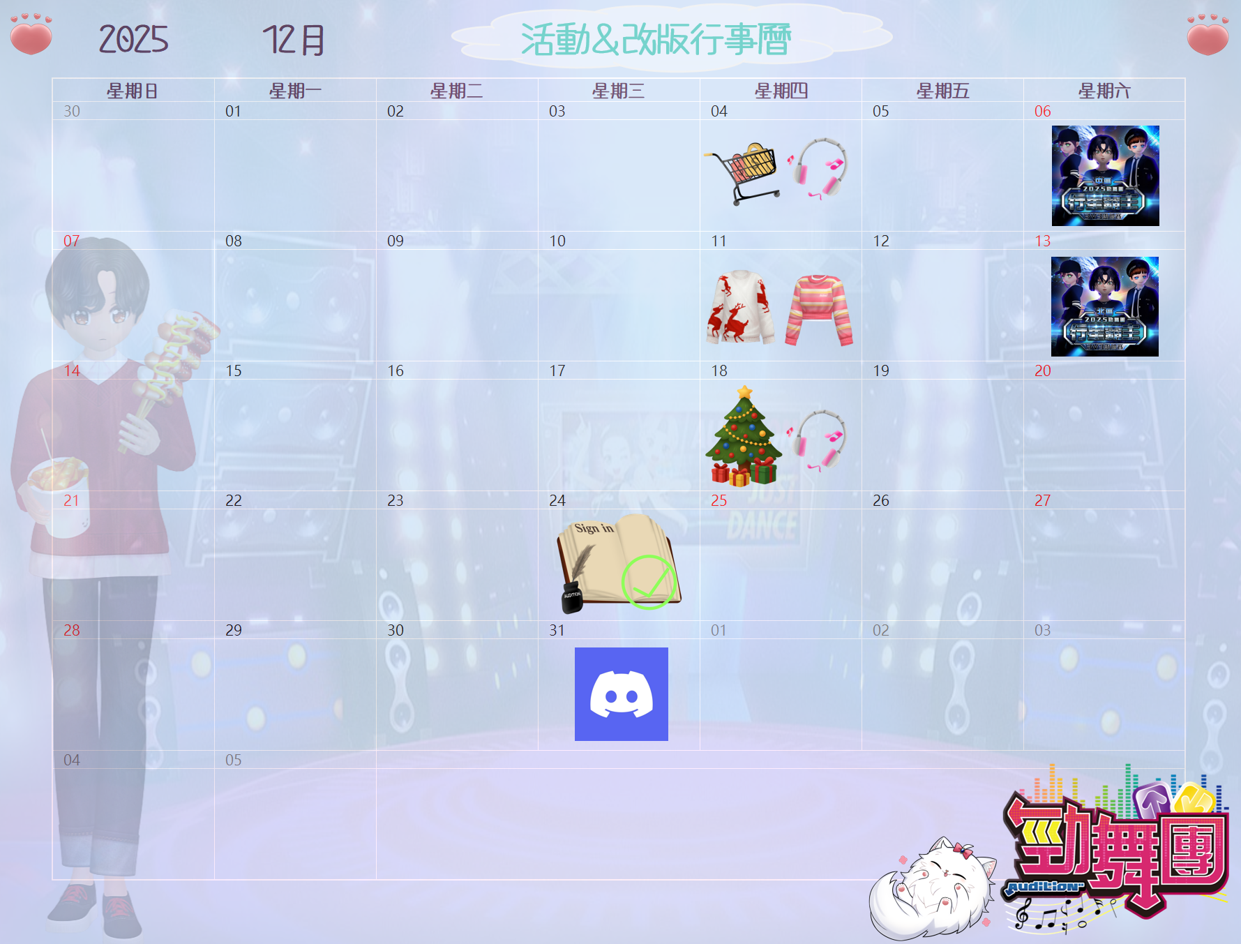 [系統公告] 十二月活動改版預告 公告人員 登錄日期 2025-11-18 09:00:00 瀏覽次數 51 ↑ ↑ ↑ 點擊可放大 ↑ ↑ ↑ 以上內容僅供參考,具體更新內容與活動請以後續公布內容為主!! 《勁舞團營運團隊》感謝全體大明星的支持與愛護Σ>―(〃°ω°〃)♡→ 回列表
